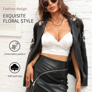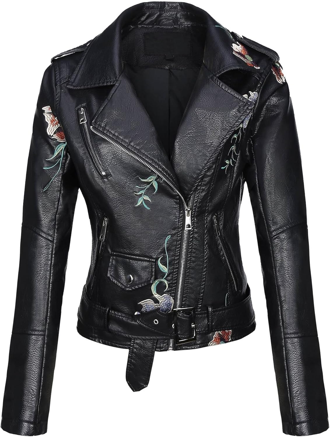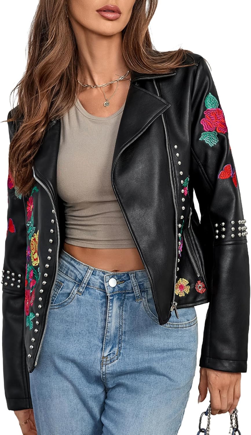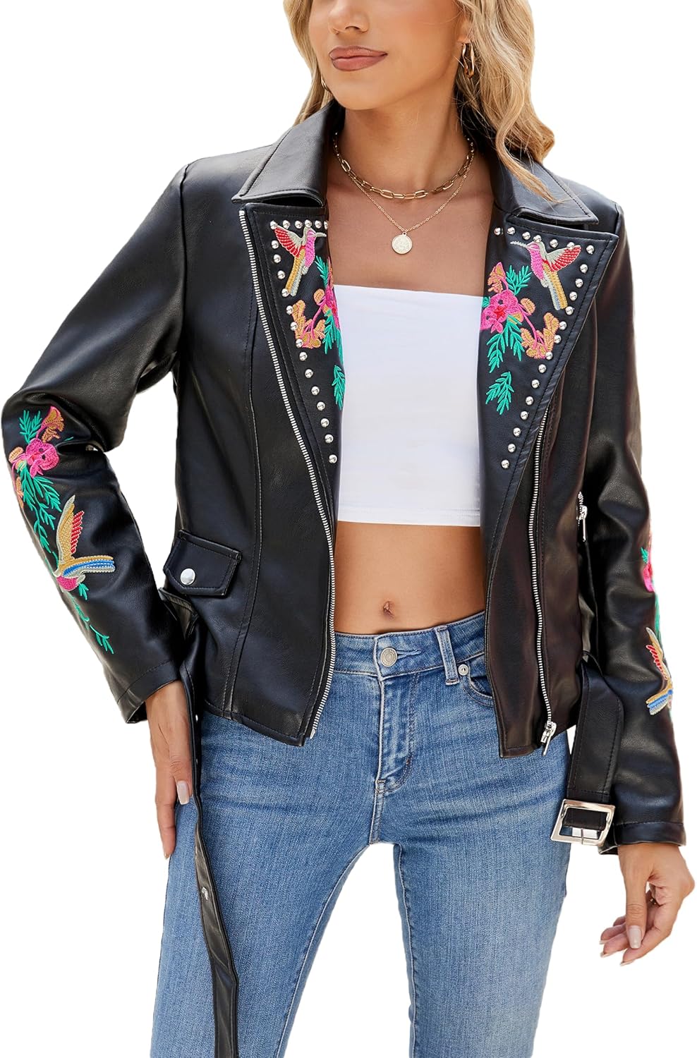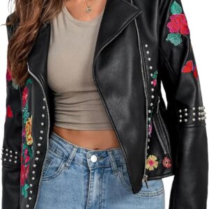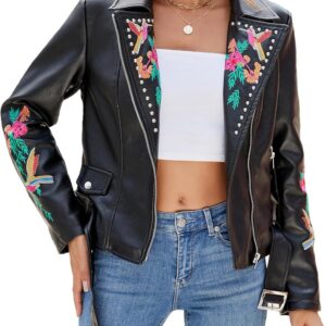Bellivera Women Faux Leather Jacket Studded Rivet Floral Moto Biker Coat
