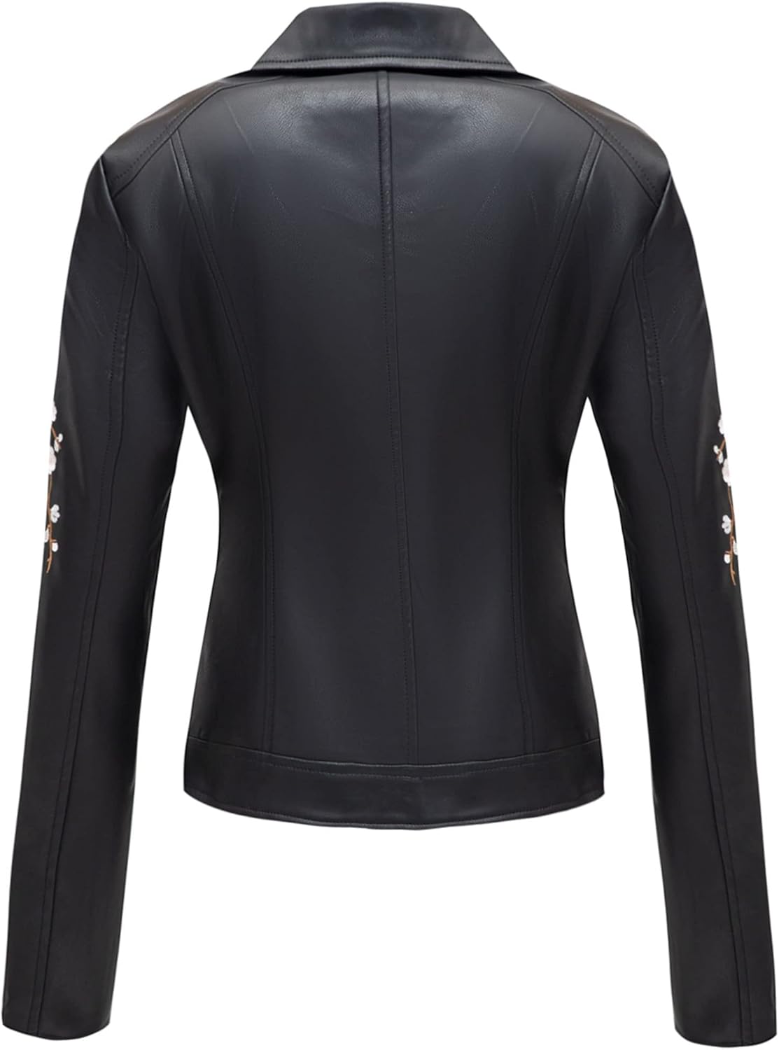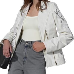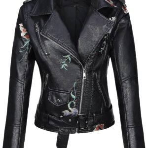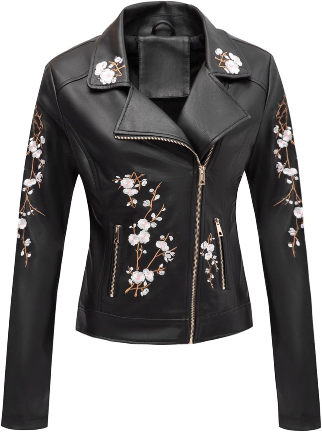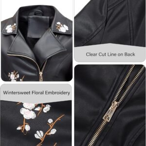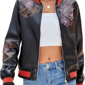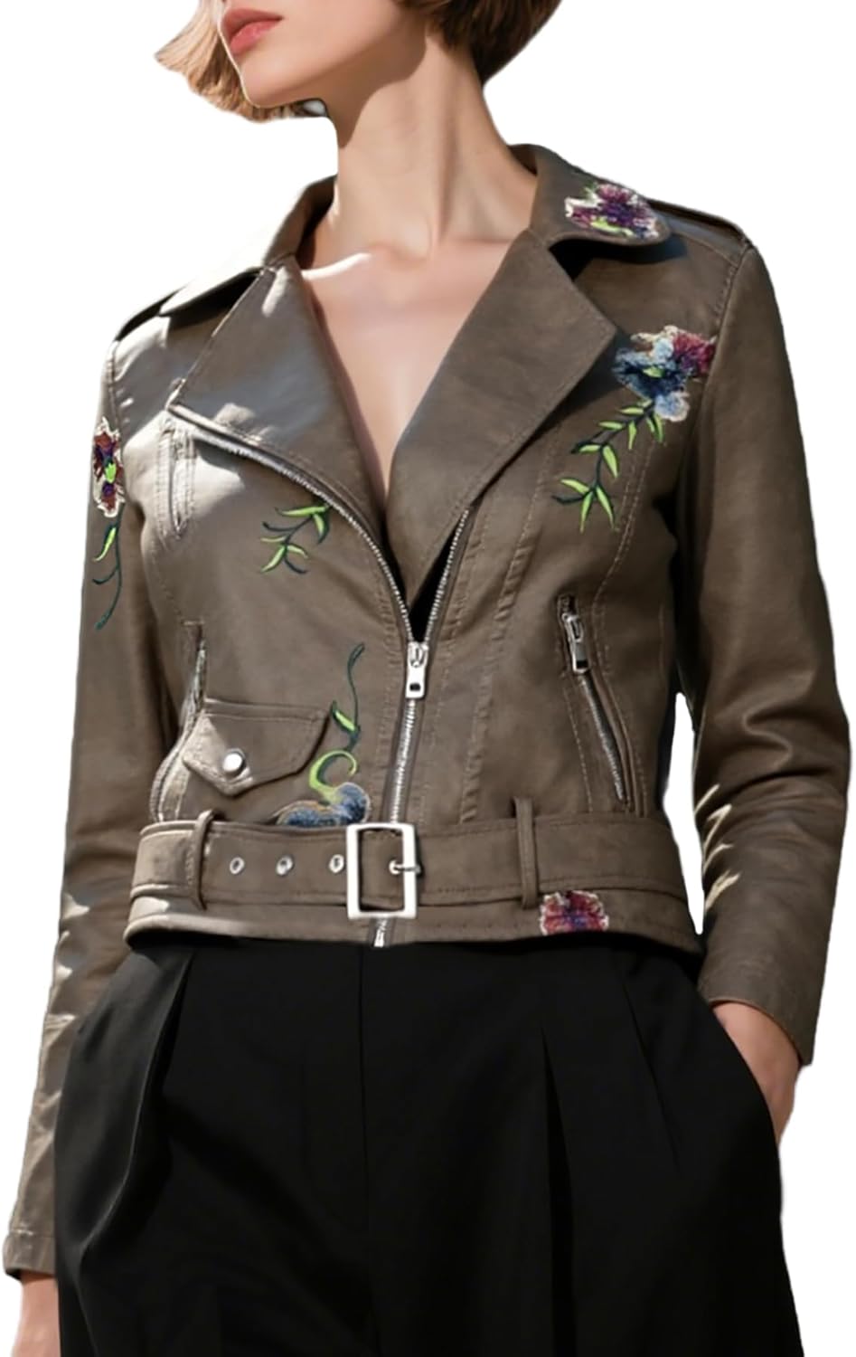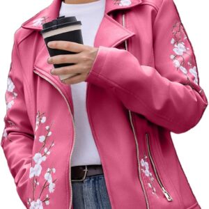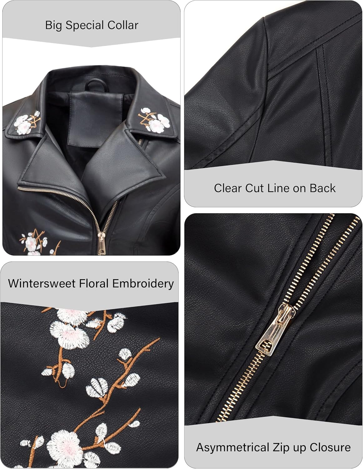 Bellivera Women Faux Leather Jacket Studded Rivet Floral Moto Biker Coat