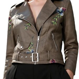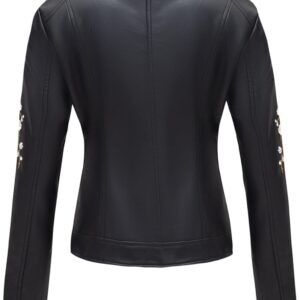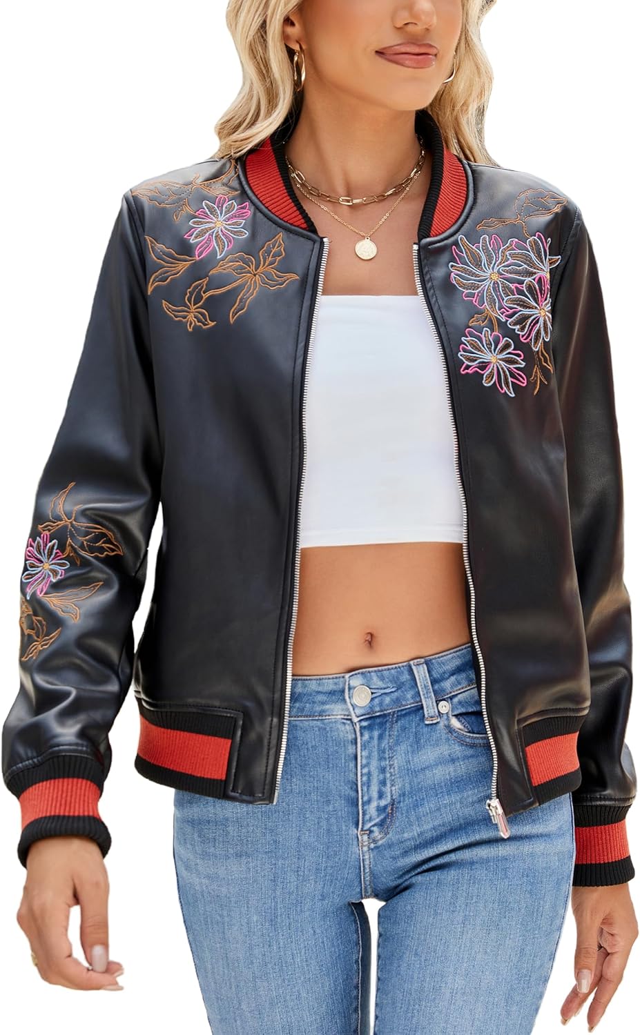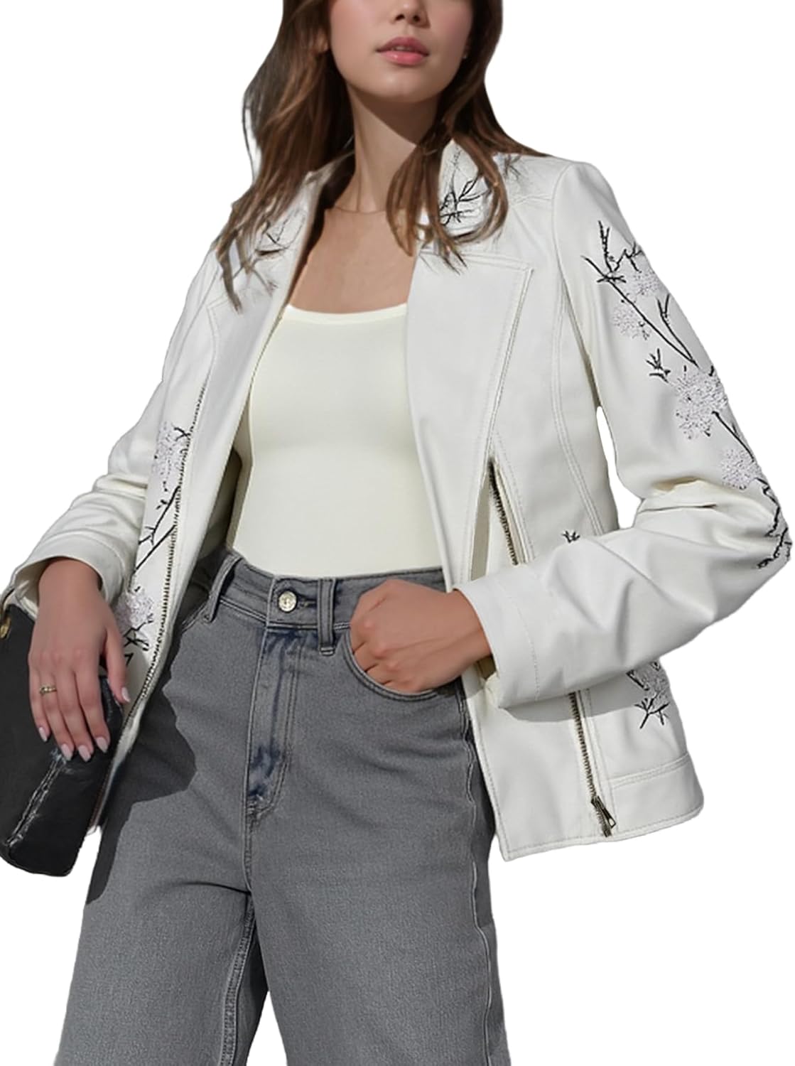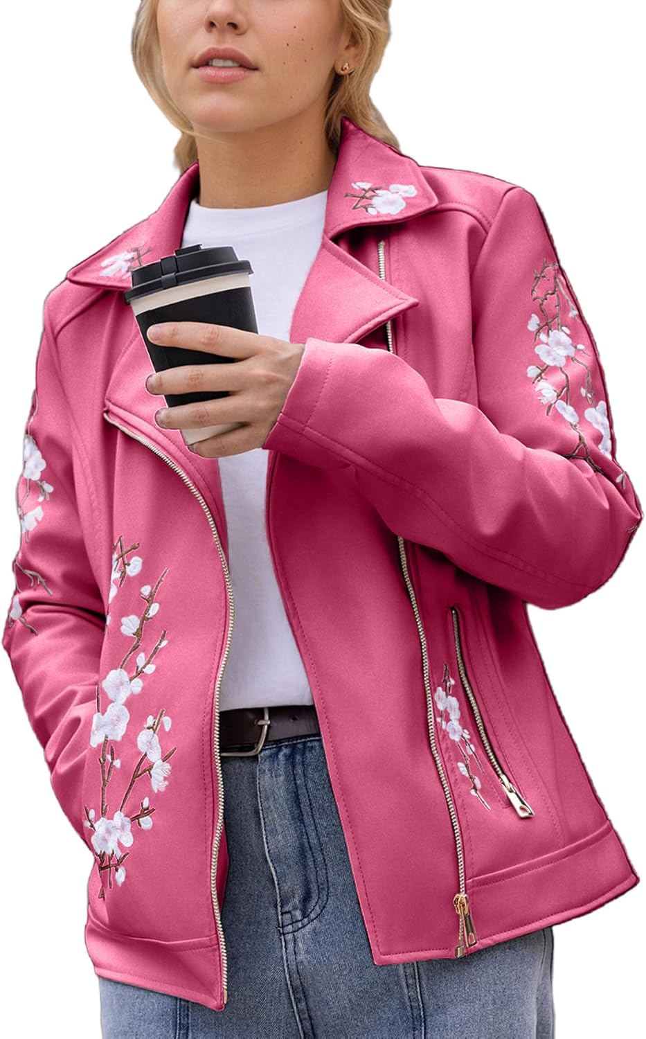 Bellivera Women Faux Leather Jacket Studded Rivet Floral Moto Biker Coat