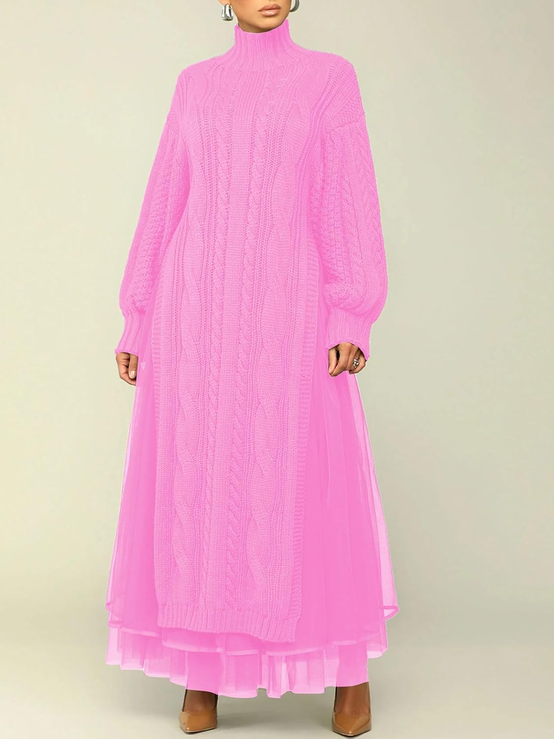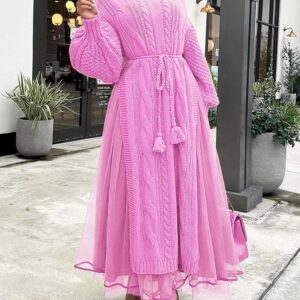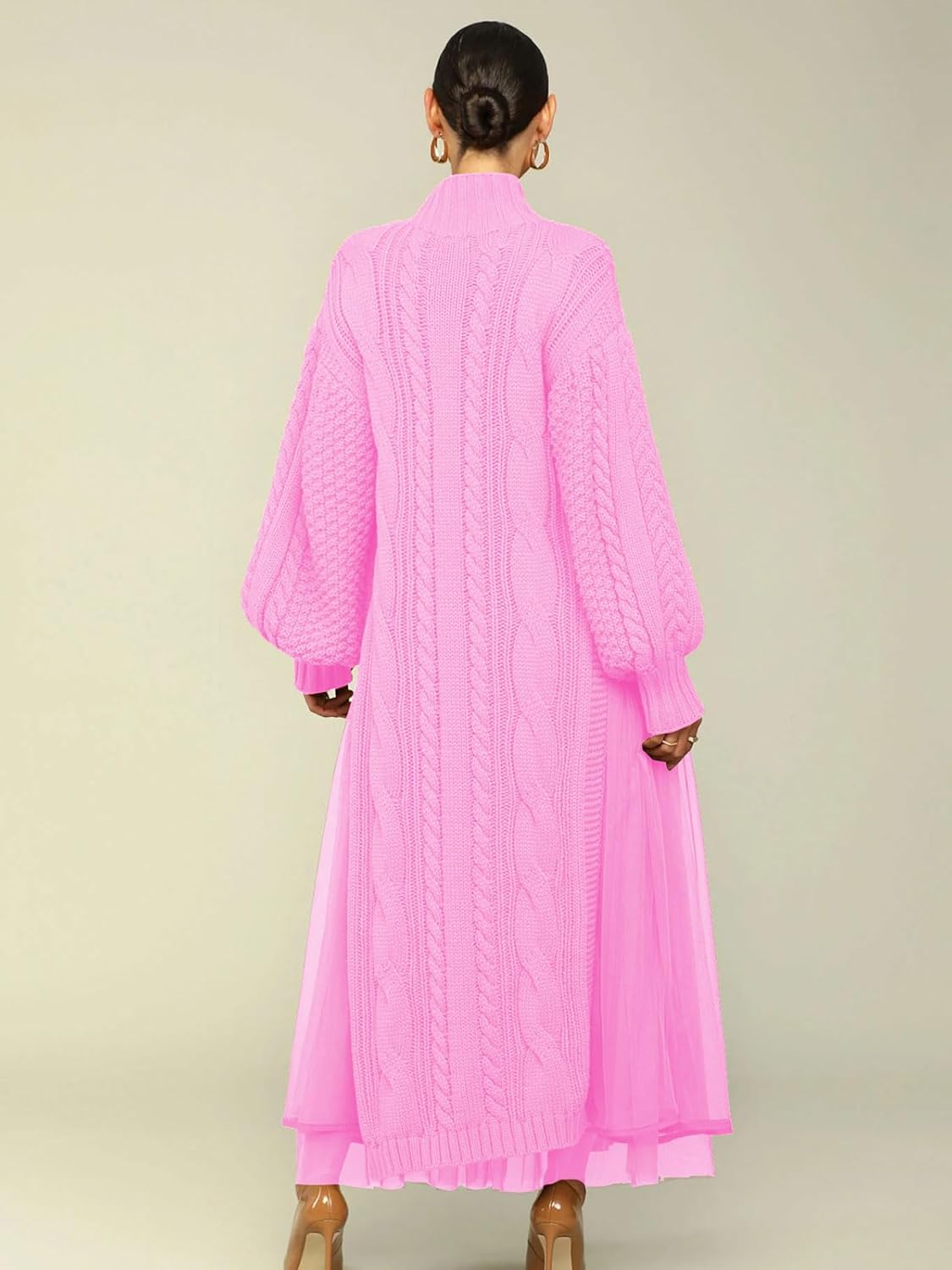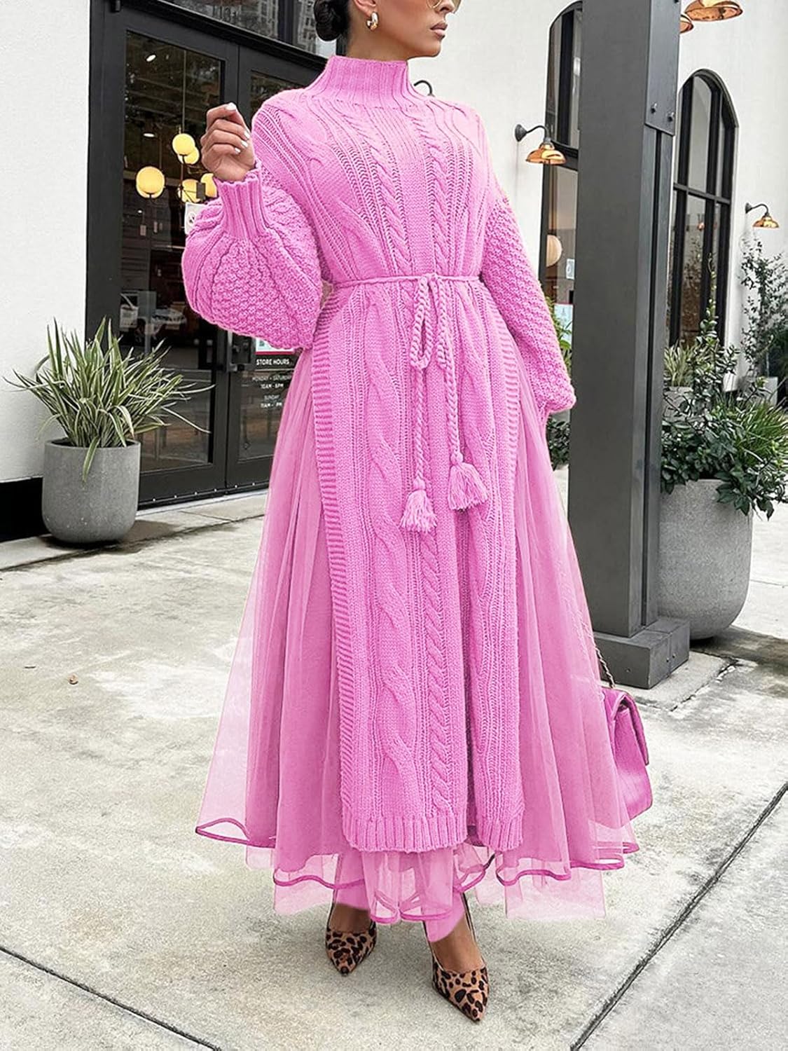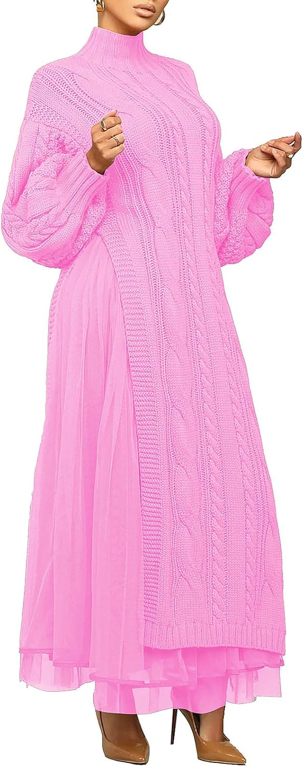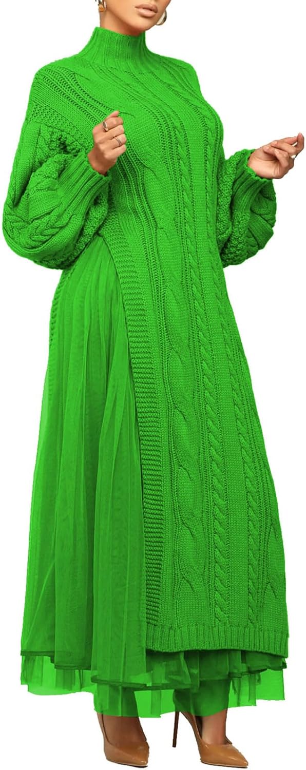 KANSOON Two Piece Fall Outfits for Women Long Lantern Sleeve Slit Sweater Dress and Maxi Tulle Skirt Set with Belt
