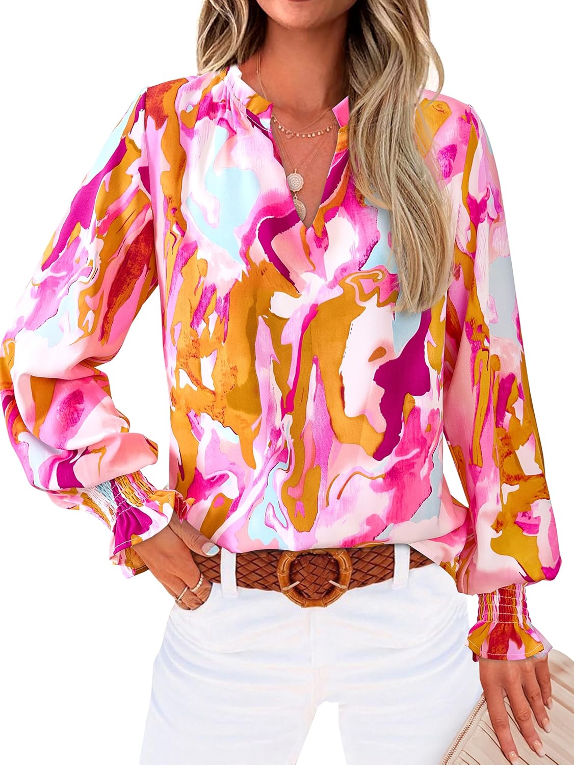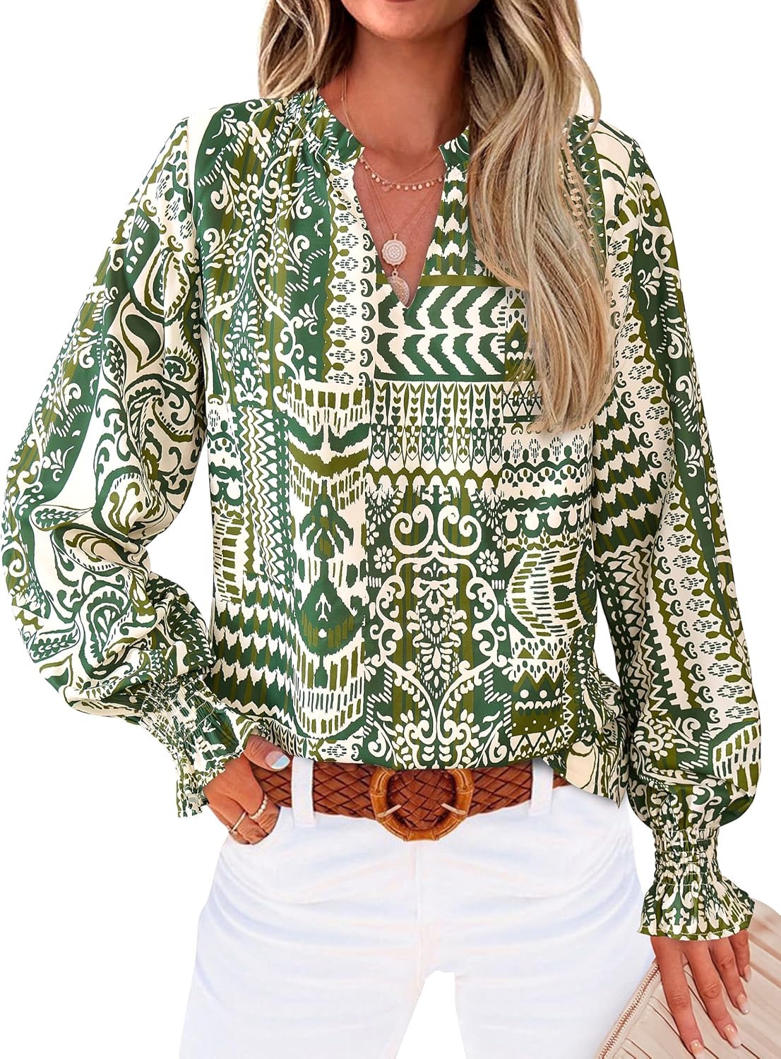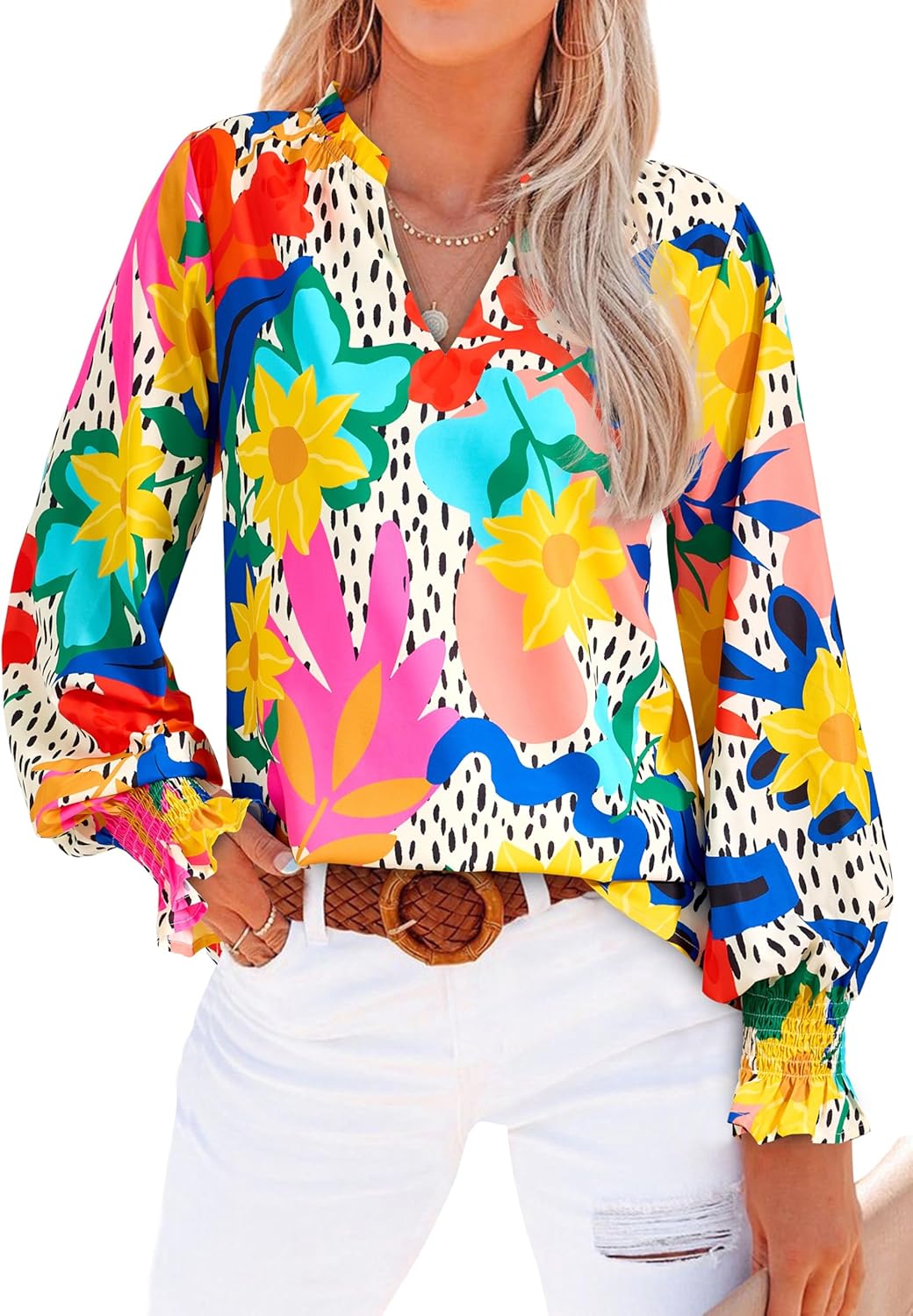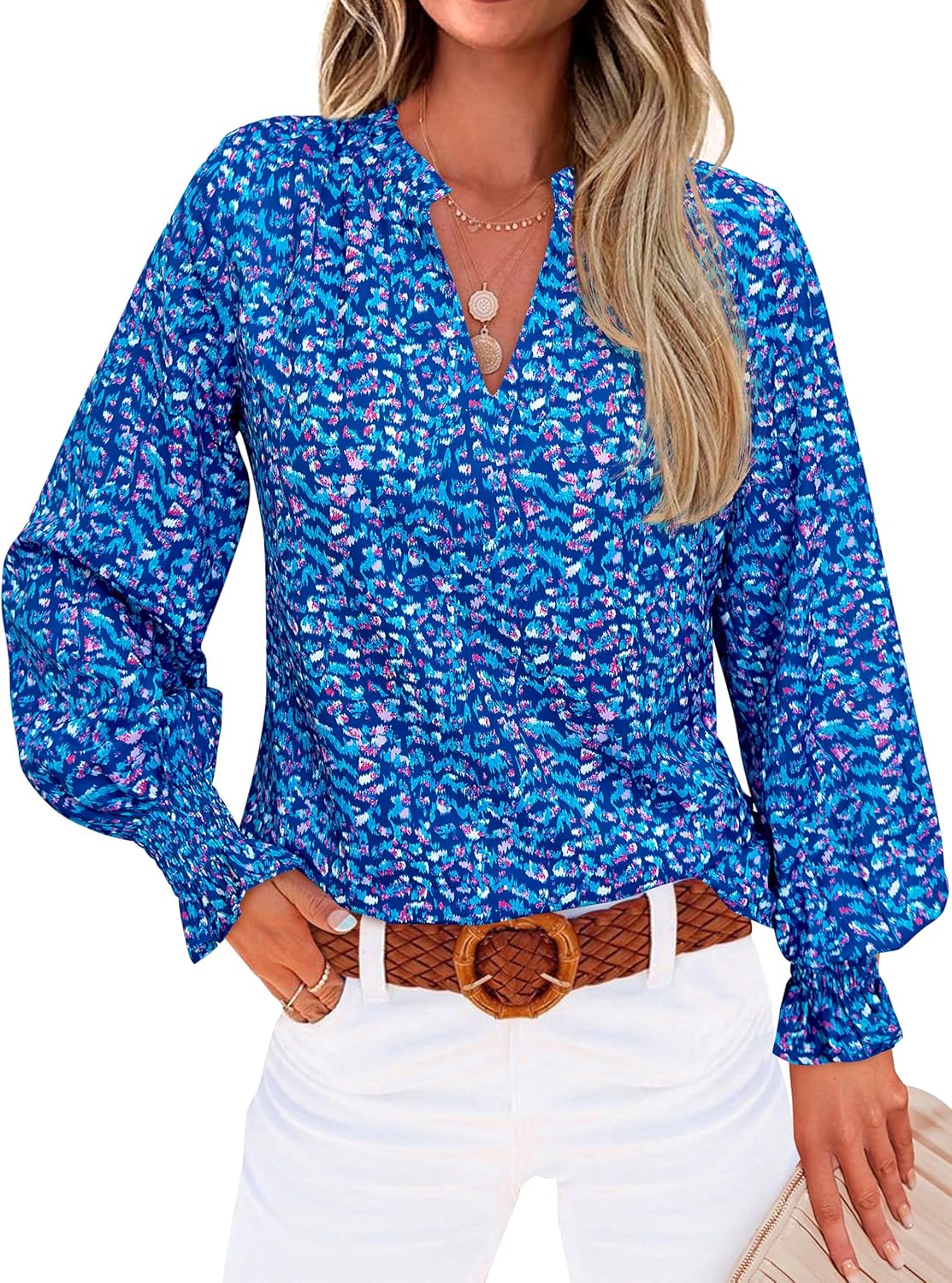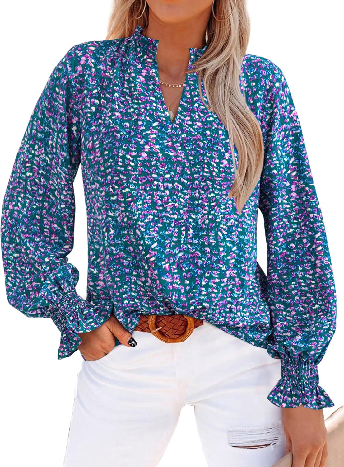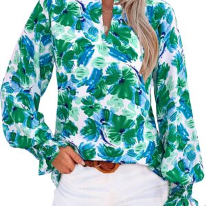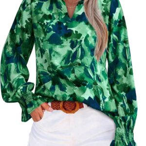 MASCOMODA Womens V Neck Floral Long Sleeve Tops 2025 Summer Casual Loose Puff Sleeve Chiffon Boho Work Blouse Dressy T Shirts