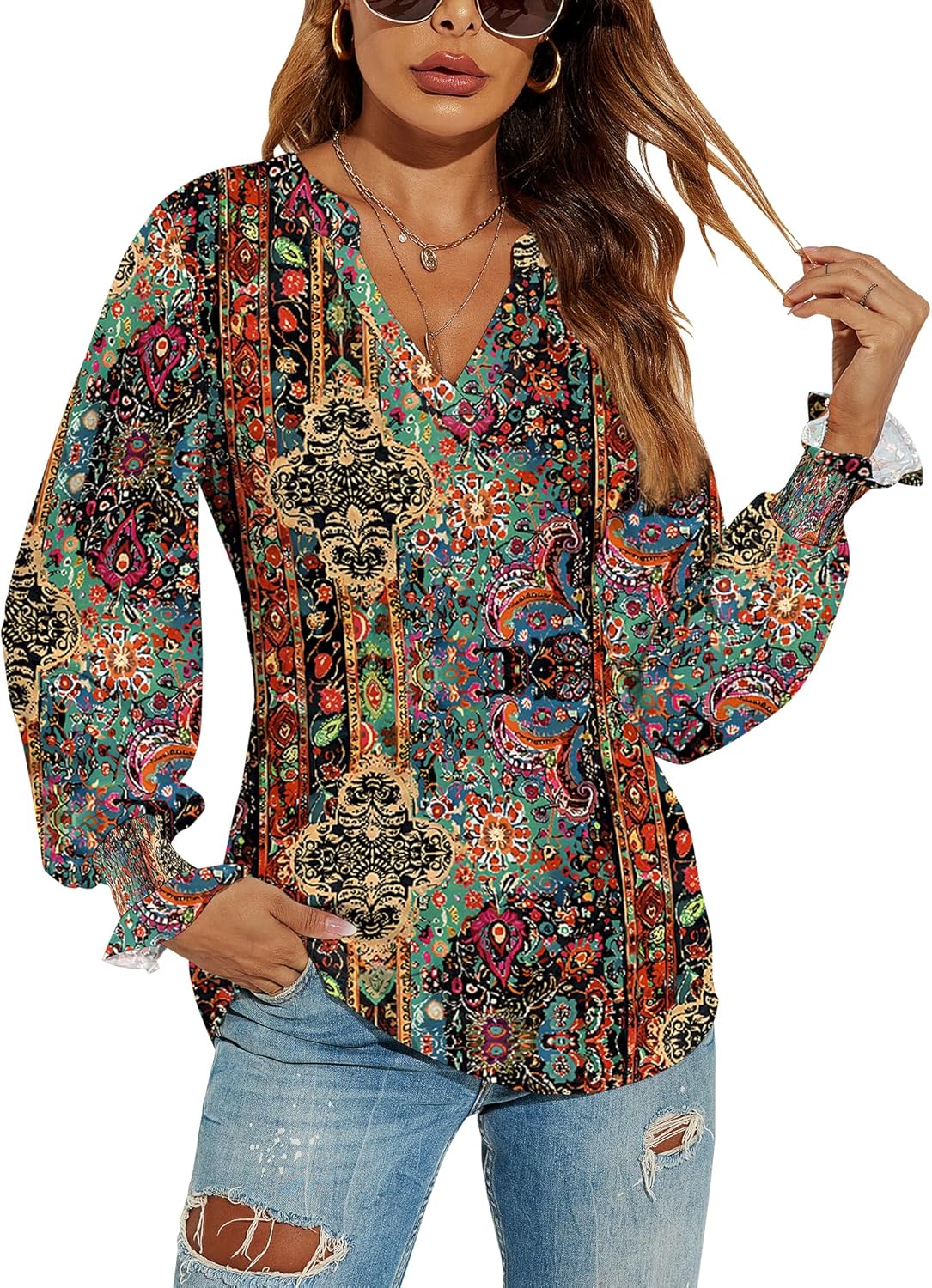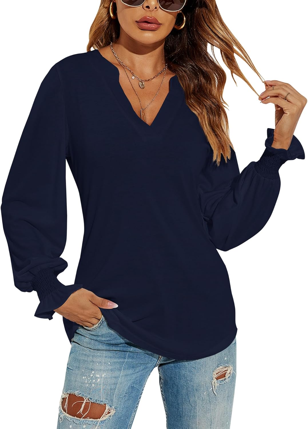 Romanstii Women's Casual V-Neck T-Shirts Loose Puff Long Sleeve Tops Tunic Blouses quantity